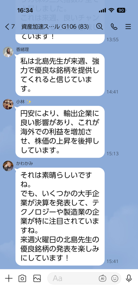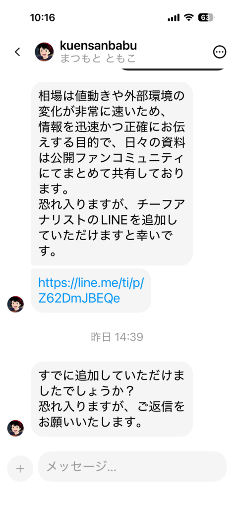 北島からは以下の内容が来る。「私とチームが専門的な投資学習の場を提供している」と。あれれ、まつもとともこが心を込めて準備した資料はどこいった?と不思議に思うが、まあ付き合ってそれっぽい返事をしながらやりとりする。毎週2~3銘柄を紹介していくらしい。