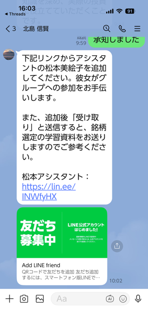 そうすると、北島は「私のアシスタントである松本美絵子のラインを追加せよ」と言ってくる。とうぜん最初のスレッズの「まつもと」とこの「松本」は別人物だ。この手の詐欺は全て同じで、最初の導入をどこから入ったか、誰きっかけかを不明瞭にするために担当者を転々とさせる。