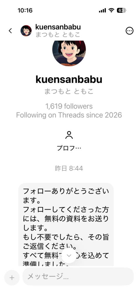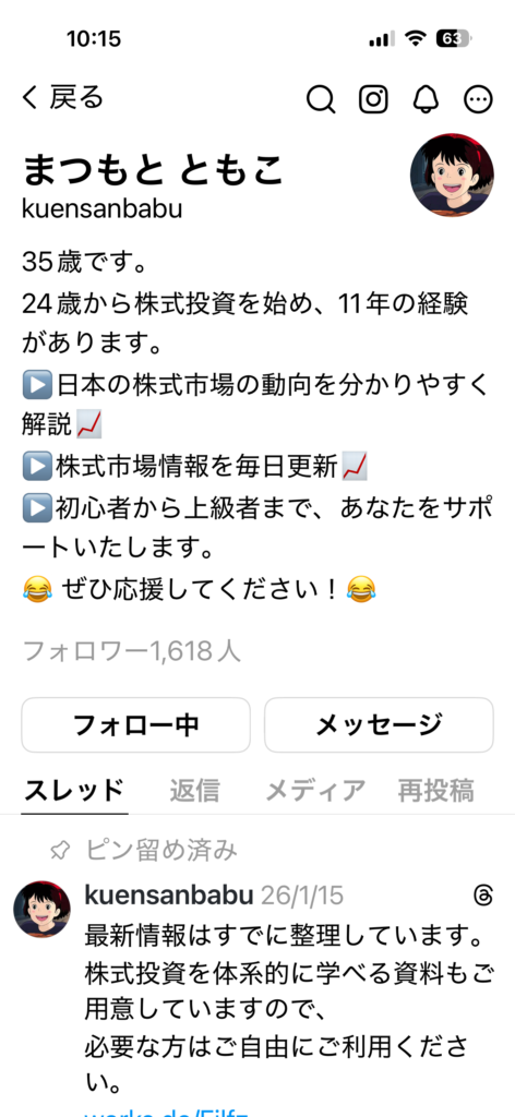 まずはこの↓画面を見て欲しい。スレッズにある普通のプロフィール画面だ。35歳で24歳から株式投資を始め11年の経験があるそうだ。この「まつもとともこ」がフィードにあげている投資情報に「いいね!」をしてフォローしてみた。