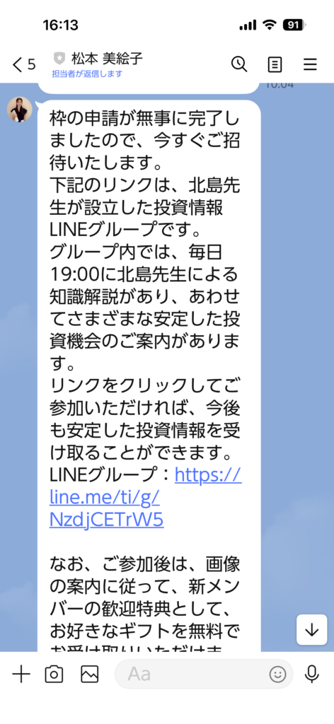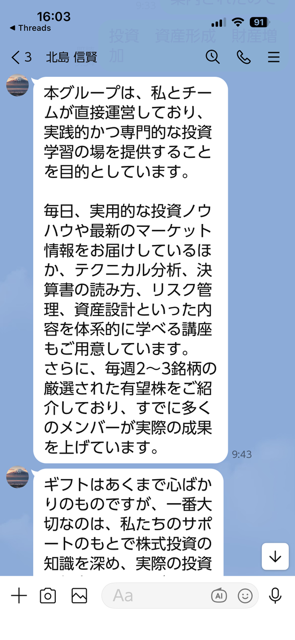 そして更に、北島先生が設立した投資グループのLINEグループに参加しないかと勧誘がある。そのグループに入ると投資情報だけではなく、様々なプレゼントがもらえる特典まであるという。