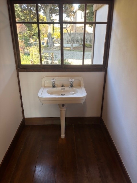 この昭和の初期に来客用の手洗いがすでに洋式だったこと、かつ下記にあるように蛇口が2つあり、お湯とお水が両方出るようになっていたことは驚きだ。