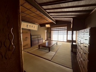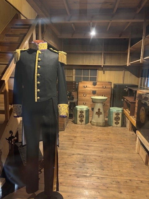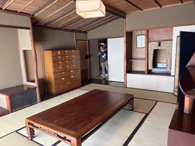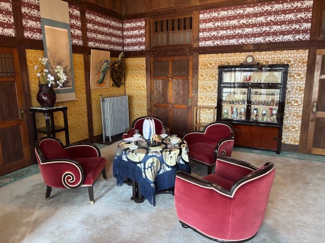 建物の中に入ると客間があり、綺麗な装飾品やテーブル、椅子など忠実に当時を再現されている。