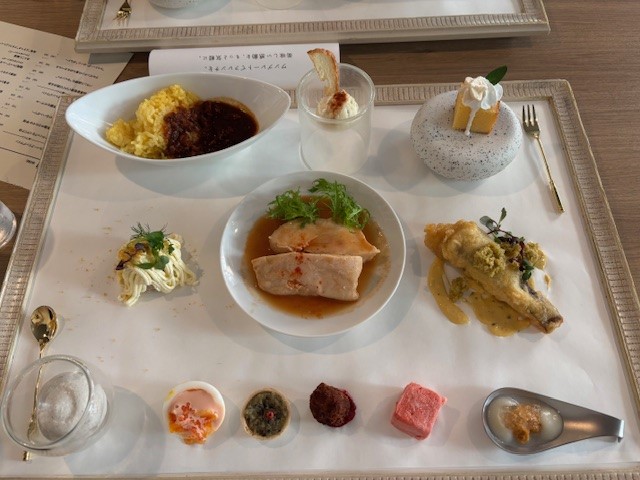 仲間とわいわいしながら食べるランチは最高である。ちょうど足腰も疲れた時間帯でのランチビールも格別だ。私が頼んだのは↓こんなプレートに。左上のハヤシライスはお替わり自由だ。