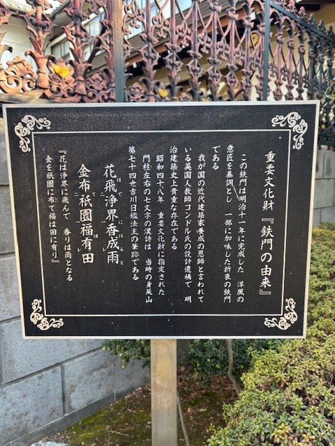 このお寺で有名なのが重要文化財にも指定されている鉄の扉だ。下記の看板を読むと「明治十一年に完成した鉄門」で英国人教師コンドル氏の設計で明治建築史上貴重な存在とのこと。昭和四十八年に重要文化財に指定された。