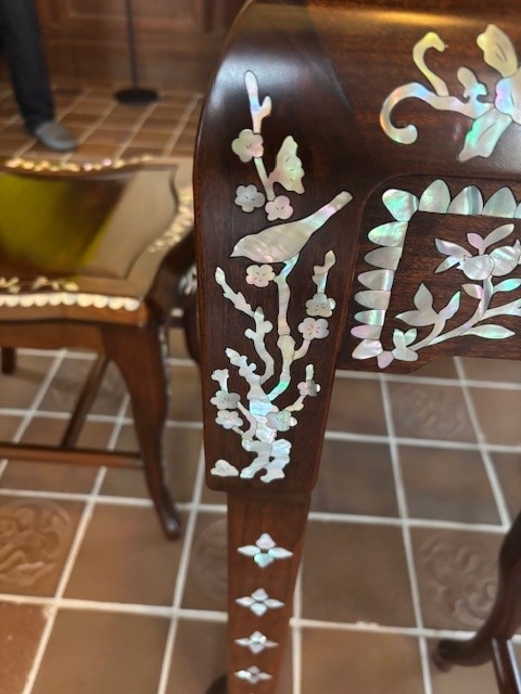 下記は中国風の意匠でまとめられた部屋で、床には龍の敷瓦があり、天井には龍が描かれた4枚の天井画が貼られている。また当時をそのまま再現したテーブルと椅子が置かれていてとても趣きがある。脚には梅と小鳥が埋め込まれている。